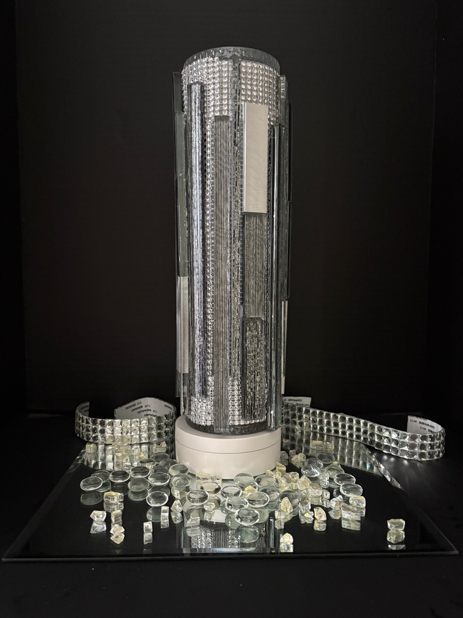 A functional illuminated art sculpture which is handcrafted with mosaic glass tiles. Vase top that holds fresh or faux flowers. Dual puck lights with 16 different colors. One-of-one collectible piece.