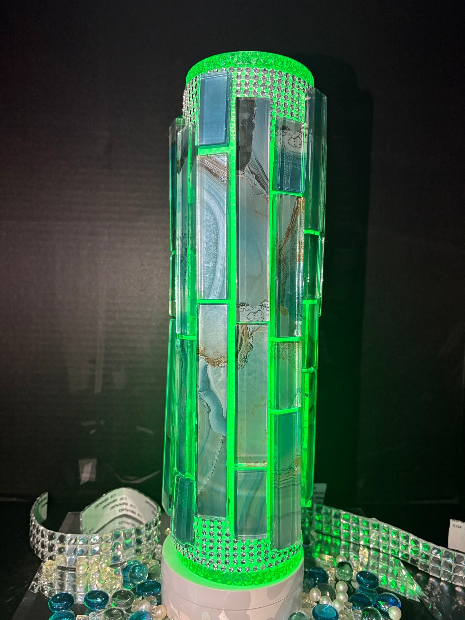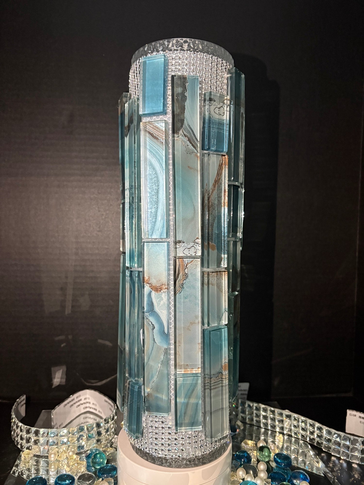This one-of-a- kind handcrafted illuminated art vase blends the strength of stone-inspired mosaic design with the elegance of modern lighting that feels both ancient and futuristic. Vase top can hold fresh or faux flowers or as a stand-alone glowing sculpture. Lighted by a 16-color puck lighting for day & night ambience. One-of-a-kind collectible piece.