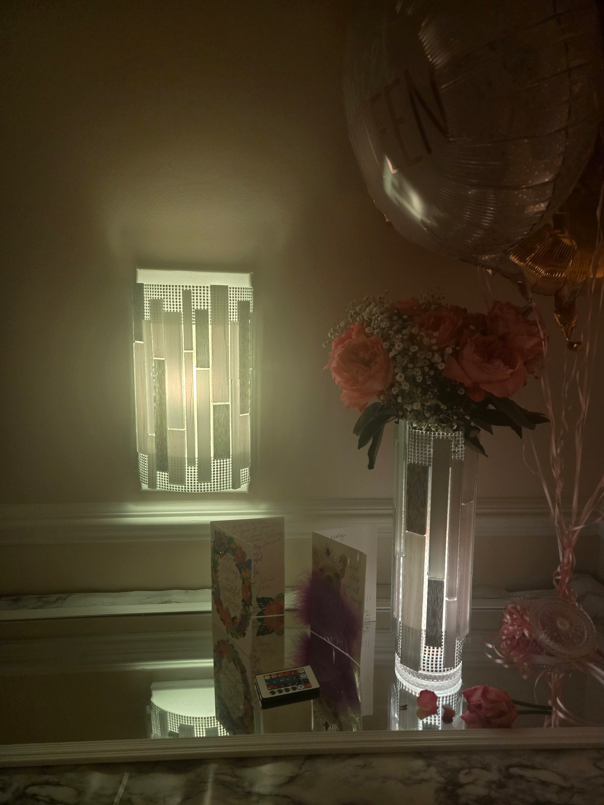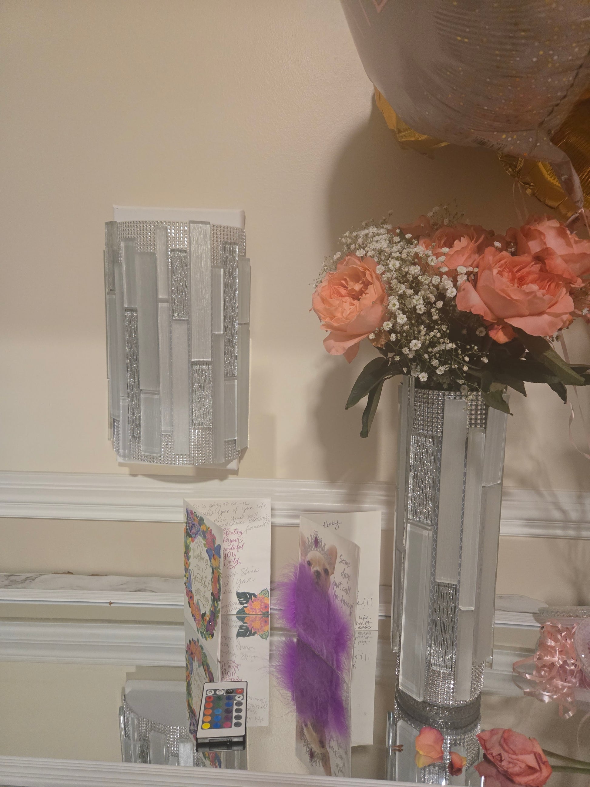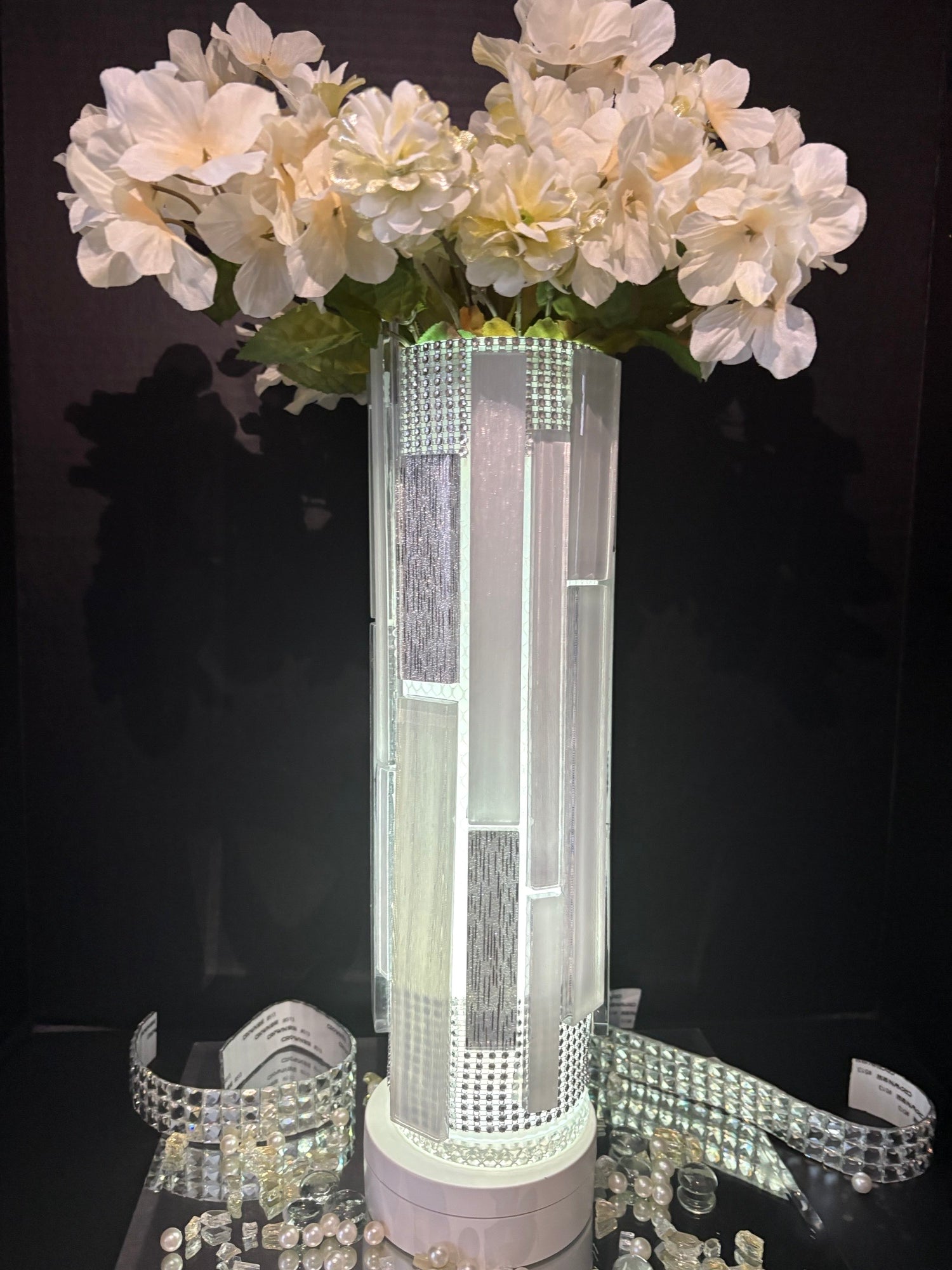 Handcrafted Mosaic Glass Tile Lighted Vase. Luxury Architectural Light Column Vase. Clean vertical geometry with frosted glow tile, silver rhinestones trim and a 16-colored puck light with remote. Vase top can hold fresh faux flowers to spruce up any space in your home. Wall sconce sold separately. Wall sconces can match any tile being sold.